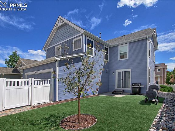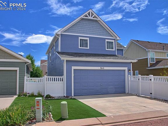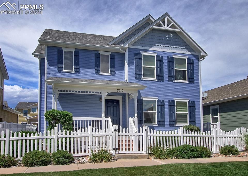 Lovely 2-story Victorian home in desired Chaparral Point at Indigo Ranch w/covered front porch surrounded by a white picket fence, with great views of Pikes Peak in this charming neighborhood! The kitchen is roomy, has lots of counter space, a separate pantry, upgraded back splash, & an island with an eating bar. All 3 bedrooms and Family Room are on the upper level, along with the laundry area that provides easy access from the bedrooms, reducing the need to carry laundry up and down the stairs. Master Bedroom has a large walk-in closet. Low maintenance yard with AstroTurf and white vinyl picket fence, with awesome mountain views. This open floor plan includes an additional 2'-option (added to the downstairs living room and upstairs family room/bonus room loft) to Classic's Cristofano Model making this home the largest in the community at 1,768 sq ft. Large windows keep this home airy and bright. Crawlspace is wonderful for storage and nearly high enough to stand up. Newly painted exterior and A/C. The neighborhood is filled with many small parks and a gazebo sets in the largest park for residents to enjoy. Close to schools, parks, shopping, and restaurants along the Powers corridor.
