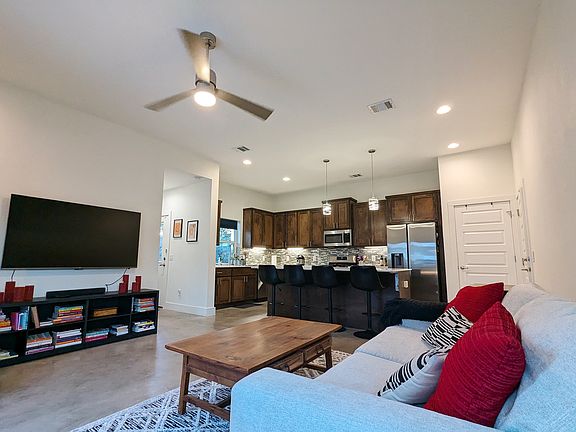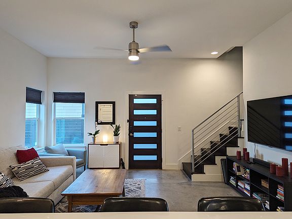 Enjoy an open floor plan downstairs with a spacious kitchen and living area featuring a dangerously cozy, custom-made couch, a 65" Fire Smart TV, polished concrete floors, and soaring 10-foot ceilings. Step outside to a private, gated backyard and side yard with ample seating, a fire pit, BBQ pit, and outdoor Bluetooth speakers perfect for entertaining or relaxing under the stars.
