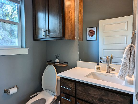 Upstairs, you'll find two thoughtfully furnished bedrooms and a shared full bath with a walk-in shower. The primary bedroom includes a large closet and built-in office desk ideal for remote work while the second, larger bedroom includes a Roku Smart TV and smaller closet. Additional amenities include a downstairs half bath, in-unit washer and dryer, and blazing fast Google Fiber Wi-Fi (400+ Mbps) suitable for streaming, video calls, and heavy remote work.