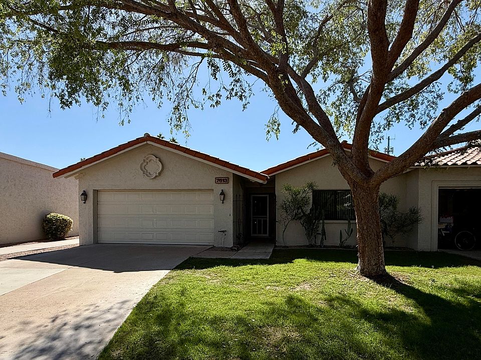 This lovely patio home is in a perfect Scottsdale location! Laminate floors throughout and indoor laundry. Two master suites, one bath has a roll in shower. The home offers soaring ceilings, a gas beehive fireplace and plenty of natural lighting with two atriums. Large enclosed south facing tiled patio includes a plumbed gas grill. New appliances, kitchen counters and flooring installed in 2017. ALL new windows in 2021, new water heater and garage opener roller in 2025. Roof scheduled for replacement with warranty to convey. Add a two car garage with shelving and security camera that convey and it is perfect Scottsdale living. All this within walking distance of grocery, walking paths and close to the best of Scottsdale's shopping, dining and nightlife. Welcome ho