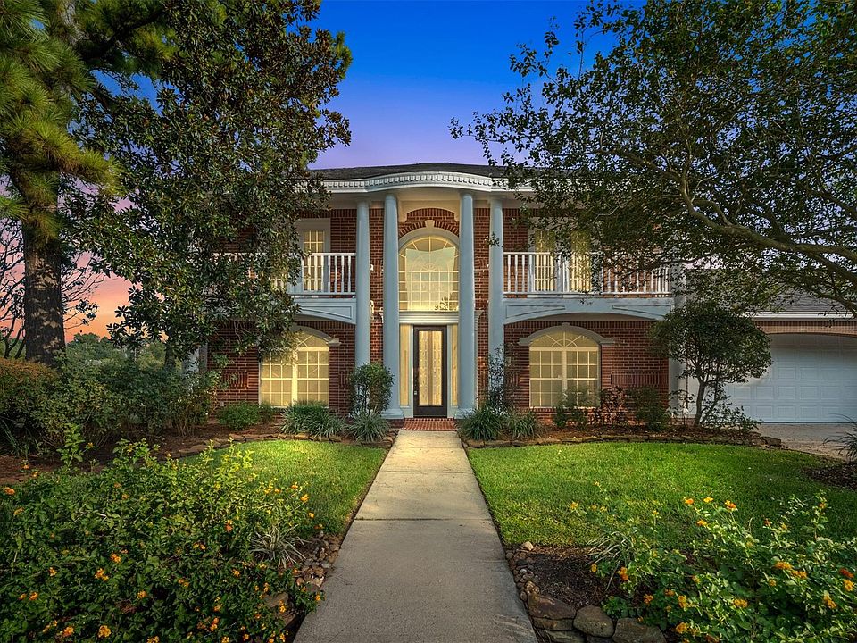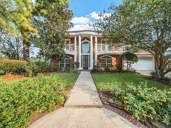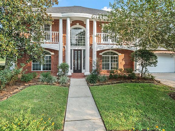 Looking for that special true custom built home.. this stately Colonial style home is it .... impressive elevation with grand exterior columns and balconies and covered porches. Interior is very open and bright with high ceilings and tons of windows and natural light. Located on a private cul de sac street sitting quietly on the golf course. Two story entry with curved staircase. Formal Dining off entry with rich wood look laminate floors. Family room with two story ceilings and wall of windows overlooking golf course, gas fireplace and two walls of built ins. Island Kitchen has been updated with quartz countertops, upgraded appliances and all new light fixtures and sunny breakfast nook . Primary en suite bedroom on first floor offers a siting area, large whirlpool tub and frameless glass shower and dual vanities and huge walk in closet. 2nd floor offers 3 large bedrooms plus large gamerrom and covered balcony. Oversized garage. New roof/carpet/flooring/light fixtures.
