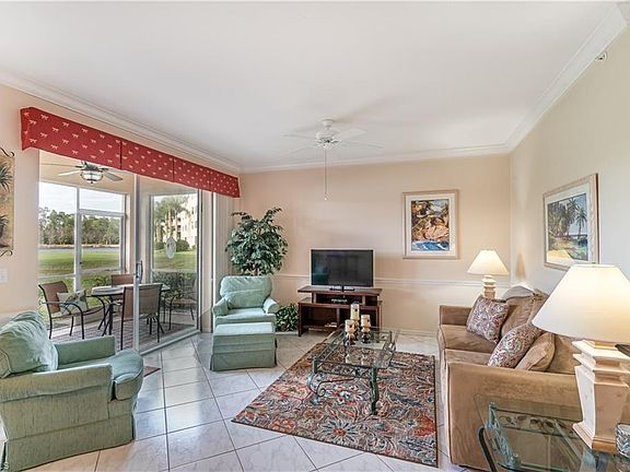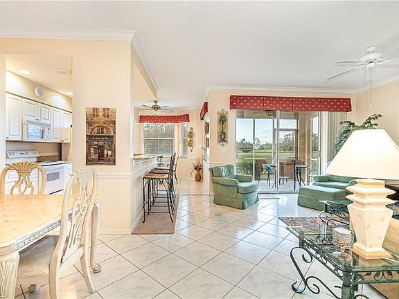 Lovely, bright First Floor Turnkey furnished condo featuring upgraded kitchen with white cabinets, granite 2-level counter-top & granite double sink, pantry with pull out drawers, crown molding and decorative chair rail, grey & white tone diagonal tile floor, newer A/C, 2 year-old roof, upgraded master & guest baths, 4x8 private storage room. 18-hole Championship Golf course & Clubhouse renovated 3 years ago with indoor & outdoor dining, fire pit, new fitness center, cabana, pools, spa, tennis courts & wonderful restaurant with social events. Over 550 acres including lakes, preserves and green space. Conveniently located across the street from pool, pickle ball and Bocce courts. View of golf course, bridge and lake! Immaculate, beautifully furnished and move in ready - just bring your clubs and relax. Naples Heritage is located only minutes to downtown and white sandy beaches.