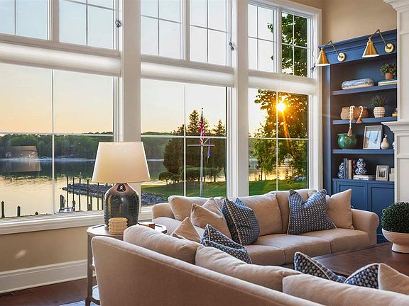 Offered for sale for the first time, this brand-new luxury residence in the exclusive gated community of Oyster Bay Pointe is a rare opportunity along the shores of Lake Charlevoix. With 107 feet of private frontage on the protected marina and an included 40-foot boat slip with upgraded custom floating dock, this meticulously designed home offers 6,475 square feet of living space, including four bedrooms and four full baths. The main floor features a spacious primary suite complete with a soaking tub, double-headed shower, sauna, and private walkout to the lakeside patio. The open-concept living area is anchored by a stone-surround fireplace with custom built-ins and flows seamlessly into the formal dining space and gourmet kitchen, highlighted by a basket weave tile backsplash, La Cornue Cornufe 110 range, and Culligan water system throughout. Expansive windows capture sweeping sunset views over Lake Charlevoix. Upstairs are three additional bedrooms, two full baths, and a generous bonus room above the garage—ideal as a bunk room or recreation space. The lower level is made for entertaining, with a theater room, kitchenette, and ample space for workouts, games, or lounging. Outdoor living is elevated with a covered lakeside patio featuring a gas fireplace, dining area, ceiling fans, space heaters, and a mounted TV. Oyster Bay Pointe offers a clubhouse, pool, tennis courts, and miles of walking trails—all just minutes from downtown Charlevoix. A premier offering in one of Lake Charlevoix’s most sought-after waterfront communities.
