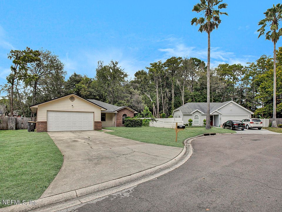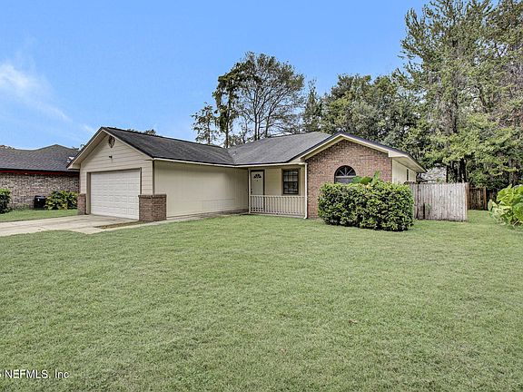 Welcome to this move-in ready 3 bedroom, 2 bath home on a quiet street in Jacksonville! Step inside to an inviting entry and dining space that flows into a spacious living room with vaulted ceilings, a brick fireplace, and plenty of natural light. The kitchen features granite counters, stainless steel appliances, and freshly painted cabinets, with a cozy breakfast nook overlooking the backyard. The split bedroom layout offers a roomy primary suite with dual vanities plus two additional bedrooms. Both bathrooms include updated vanities with stone tops. Enjoy the large fenced yard with mature trees, perfect for relaxing or entertaining. Fresh paint and carpet make this home truly turnkey. With a 2-car garage and a great location near shopping, dining, and commuter routes, this home is priced to sell and ready for its next owner!