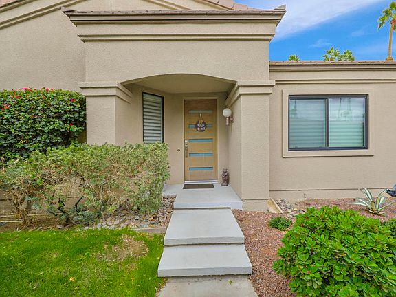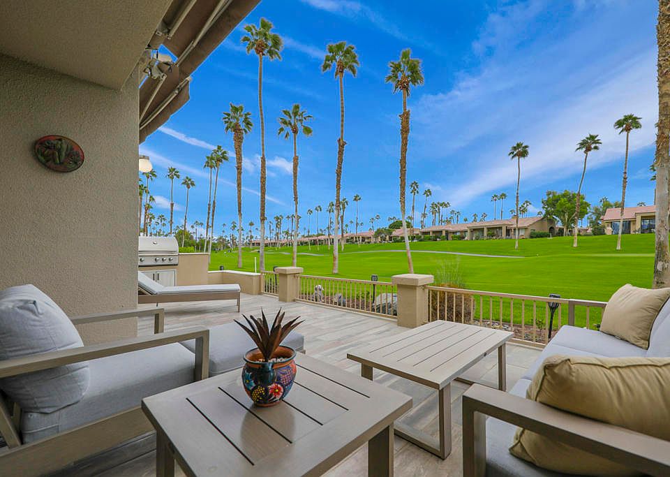 Welcome to this beautifully renovated 3-bedroom, 3-bath condo at 76167 Impatiens Circle in Palm Valley's most sought-after location. This 1,650 square foot home sits on a quiet cul-de-sac with stunning south-westerly views of the San Jacinto Mountains and the Championship golf course, next to the 9th hole tee boxes. The quality renovation in 2015 took this unit down to the studs, creating an open floor plan with raised celings, recessed lighting, and custom features throughout. The kitchen showcases waterfallquartz countertops, built-in appliances, custom cabinetry, and a breakfast bar perfect for casual dining. The thoughtful layout includes a primary suite, 2nd bedroom with private ensuite bath, and a versatile den that works as a 3rd bedroom. A smart conversion of the laundry room created an additional 3/4 bath with shower. The Cottonwood floorplan has been opened, producing a bright and airy living space wide open views of the golf course. Step outside to the extended back patio featuring built-in BBQ, electric awnings with remote control, and seamless flooring that flows from the interior living areas. It is a very comfortable leisure area to relax & enjoy the views.The beautifully enhanced garage offers new epoxy flooring and custom built-in storage cabinets. This prime PVCC location puts you near 3 community pools and close to the 100K SF Clubhouse and 3 dining areas. PVCC offers 2 golfcourses, 12 tennis courts, 12 P-Ball courts, and a 1st-rate Fitness Center offering a Spa and many classes to choose- Reformers Pilates, Yoga, Tai-Chi and more . The neighborhood offers easy access to world-class amenities including the Acrisure Arena, the upscale El Paseo Shopping District, scenic hiking trals at Palm Desert Cross, & the prestigious Indian Well Tennis Garden. This ready and fully furnished move-in home has been meticulously maintained. The HVAC system has been regularly serviced, w/ new 4-ton compessor unit installed in 2020. The Desert environment provides year-round sunshine and mountain views, making this an ideal retreat or permanent residence in one of Southern California's premier golf communities. Get ready to enjoy the good life and have lots of fun. Your new home awaits you with everything you need to arrive and enjoy your new surroundings.