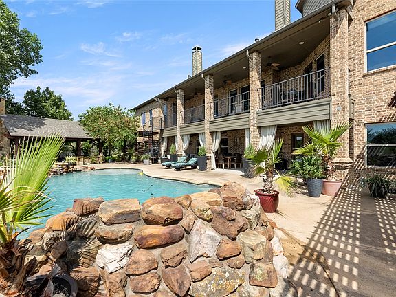 Luxury Views Near Eagle Mountain Lake! Experience exceptional living in this stunning multigenerational estate. Premium amenities, and unmatched space for entertaining, relaxing, and living in total comfort. This expansive home features 5 bedrooms, 5 full bathrooms, 4 spacious living areas, a dedicated office, 3-car garage with a lift to the attic, blending timeless elegance with modern convenience and functionality. A beautifully landscaped entryway welcomes you with a tranquil koi pond and fountain, setting the stage for the refined interiors. The chef inspired island kitchen is ideal for entertaining, stainless steel appliances, double convection ovens, granite countertops, two sinks, walk-in pantry, and extensive cabinetry. Retreat to the private primary suite featuring dual vanities, a jetted tub, separate shower, heated floors, and an oversized walk-in closet. The main level also includes a guest bedroom and adjacent bath, formal dining, home office, and a large utility room with built-ins. Enjoy enhanced luxury throughout the home, including: Climate controlled wine room, Large secure safe room-storm shelter. Upstairs living space with full bath and wall of windows showcasing views. Geothermal heating and cooling system, 40+ seer rates for maximum energy efficiency. Private water well for gardening and pool, reclaimed water irrigation system. The walk out basement transforms into its own living space—complete with a large kitchenette, living area, three additional bedrooms, and two full bathrooms—perfect for entertaining or multigenerational living or hosting long-term guests. Step outside to your private resort-style oasis, featuring: Pool with spa and waterfall, Large covered outdoor entertaining area with fireplace,