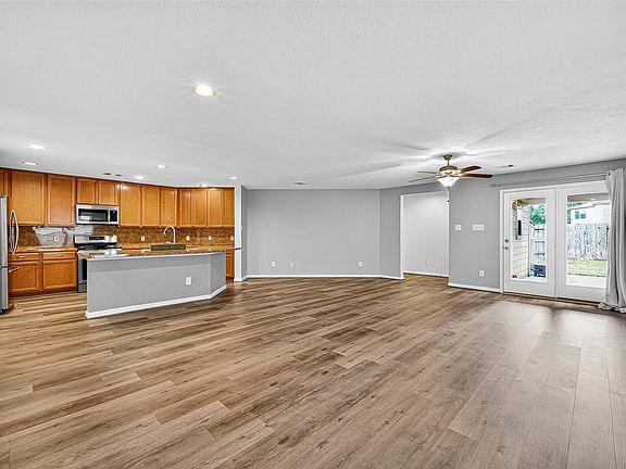 Private backyardLaminate wood flooringStainless steel appliancesCovered patioSpacious kitchen