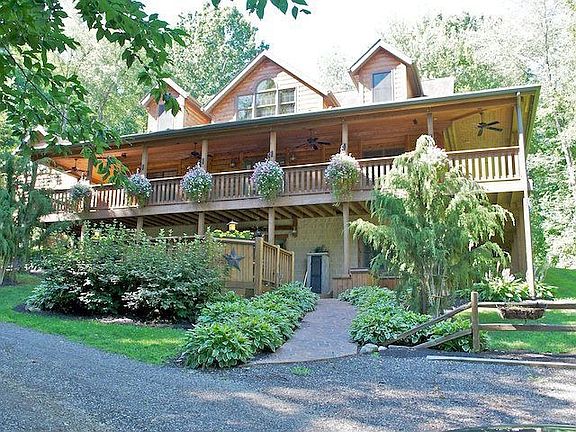 Strategically set back a long winding drive, with stocked pond & wooded backdrop. This custom built log cabin features an expansive wrap around porch, quality materials, walkout basement, incredible landscaping, 3 car garage and storage shed. Skylighted vaulted ceilings and a soaring stone gas log fireplace are the focal point of the dining room and fully applianced kitchen including a cooktop & built-in wall oven. First floor master suite and laundry, 2 large upstairs bedrooms with full bath, plus the lower level includes a rec room with wet bar, 4th bedroom and full bath. Music studio/ bonus room above the garage includes a half bath too! Tons to see !