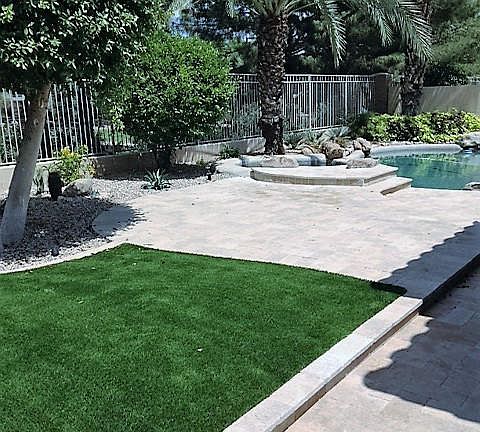 AMAZING RESORT STYLE BACKYARD backing GREENBELT!Complete with BEAUTIFUL landscaping that includes PALM TREES, EXTENSIVE TRAVERTINE covered patio & deck,synthetic grass,HEATED POOL & SPA, & GORGEOUS night lighting! Open concept and split bedrooms make this house a must see! New 16 SEER York HVAC in 2012, Granite countertops throughout, seamless glass shower, Jacuzzi tub, double sinks in both baths, oil rubbed bronze fixtures throughout.New MODERN ceiling fans & lighting in 2015.New Kohler toilets in 2016, Recirc pump installed in 2014.CUSTOM made linen drapery panels in master bedroom and family room installed in 2016.BUILT-IN office & family room cabinetry & gas fireplace complete this INCREDIBLE home!Located within walking distance to Basha Elementary School & AWARD WINNING Hamilton High!