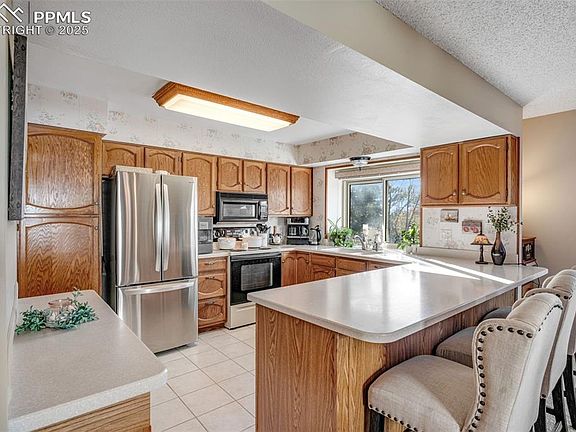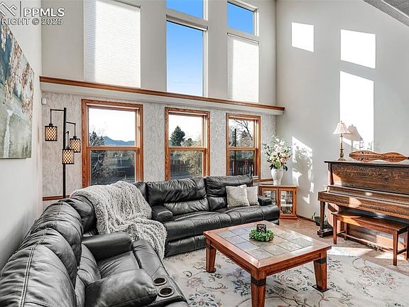 This 2-story Briargate home stands out with exceptional landscaping, incredible natural light, and multiple living spaces perfect for a growing or multigenerational household. The formal living room features a dramatic wall of windows, while the spacious kitchen offers oak cabinetry, Corian counters, a breakfast bar, and beautiful Pikes Peak views. The adjoining family room includes a wood-burning fireplace and walks out to a deck with unobstructed mountain views. The primary suite includes a walk-in closet, a 5-piece bath, and a private deck with a hot tub. Upstairs, a catwalk opens to a sun-filled loft, with two large bedrooms and a full bath nearby. The walkout basement provides a fully independent living area with a second family room, a new wet bar being installed, a large bedroom, and a full bath—an ideal setup for teens, guests, or in-laws. Outside, enjoy low-maintenance, curated landscaping with vibrant spring perennials and a producing apple tree, plus two storage sheds. The garage is fully insulated and finished with an extensive workbench and cabinetry. Additional highlights include a brand-new Presidential roof (2025), electric panel, gutters and downspouts, newly resurfaced decks, and all bathrooms updated with new lighting and toilets. With three levels of living, flexible spaces, and stunning views throughout, this home is ready to fit your lifestyle.
