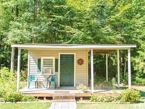 Single-owner home sits on 7 acres surrounded by hardwood trees. Natural lighting through out the home. 3 skylight is both bath and kitchen. Ceiling fans in bedrooms, den and living room. Three raised garden beds, manicured landscape, paved circular driveway. Electricity outlets and lighting in the 2 car-detached garage, the metal-sided shed, and the additional storage house, which also has covered porch and AC unit. Enjoy the out door patio with family and friends from double doors off the Sunroom.
