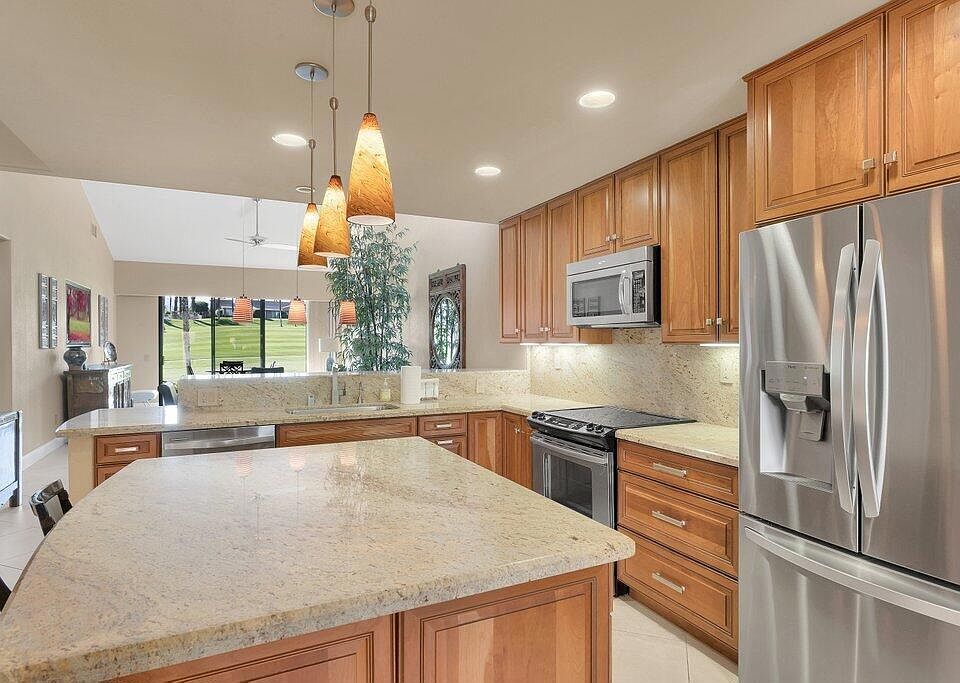 PRICE IMPROVEMENT! This is a MUST SEE property! This open concept remodeled Palm Model at 1549 sq ft was reconfigured as they removed walls & dropped ceilings to create an open space for entertaining that flows from the tiled courtyard through to the fairway patio offering spectacular SOUTHWEST FACING WATER VIEWS of the #7 hole on the Championship course. The dream kitchen features SLAB GRANITE counters and back splash, state of the art STAINLESS STEEL appliances, beautiful wood cabinetry with self-closing drawers & added GRANITE ISLAND/BKFST BAR with pendant lights. The roomy Master Suite has built in dresser, coffered ceiling, flat screen TV. The baths all have granite counters, rich wood cabinets and DAMLESS walk in showers. Other features are 5 panel SOLID CORE doors, 4 flat screen TV's, L/R sound system, 18'' tile on the diagonal throughout, ceiling fans. NEW LG counter depth refrigerator with integrated Sphere Ice Molds. Garage has epoxy floor. Recirculating hot water pump installed.Ideal for the full time resident or seasonal vacationer, Palm Valley CC is one of the very few communities that permits both long and short term rentals.100,000sf clubhouse with restaurant, bar, fitness center, day spa & salon.Separate membership is required for golf, tennis, pickleball and fitness center. No initiation fee & there are NO F&B minimums.