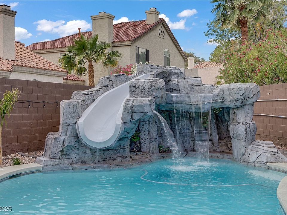 ***NEW PRICE ! REDUCED $55K **Mortgage savings may be available for buyers of this listing** Desert Shores stunner with incredible access to Summerlin and top-rated schools! This entertainer’s dream located in a cul-de-sac boasts a large sparkling pool with grotto, slide, waterfall and heated spa! (2 pumps, 6 jets), and low-maintenance synthetic grass. Enjoy two covered patios, a balcony off the primary suite, Tuff Shed for extra storage and notable is the 2 car garage that has an extended workshop. MUST SEE !Soaring vaulted ceilings welcome you into a beautifully updated home featuring an all-stainless KitchenAid kitchen, walk-in pantry, stylish new lighting, and separate family room with fireplace. The spacious loft (perfect for an office or gym) includes a storage closet. The luxurious primary suite offers a dual fireplace, walk-in closet, dual vanities, separate tub/shower. All this on a quiet interior cul-de-sac lot. New HVAC. Community features 4 scenic lakes and jogging trails!