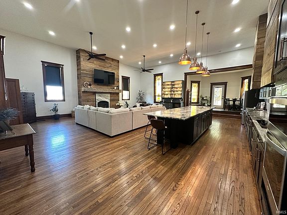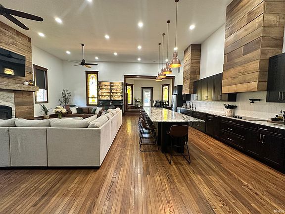 This remarkable property began as a historic church and has been masterfully transformed into one of the most stunning homes in the area. Soaring 14’ ceilings, original hardwood floors and trim, and a wood-burning fireplace with a slate hearth, marble surround, and reclaimed barn wood face set the tone for the open-concept great room. The gourmet kitchen boasts a 15’x4’ Brazilian marble island, stone countertops, walk-in pantry, and custom cabinetry. The main-level primary suite features a spa-like bath with custom tile and a luxurious two-story walk-in closet. Also on the main floor are a second bedroom/office, laundry room with custom sink, half bath, and oversized 2-car garage. The finished lower level is designed for entertaining, complete with a family room, custom bar/kitchenette, third bedroom, full bath, mechanicals room, and a private entrance. The property includes two additional parcels with 2.5+ acres and an accessory storage building. Don’t miss this rare opportunity to own a home that truly blends history, craftsmanship, and modern comfort!