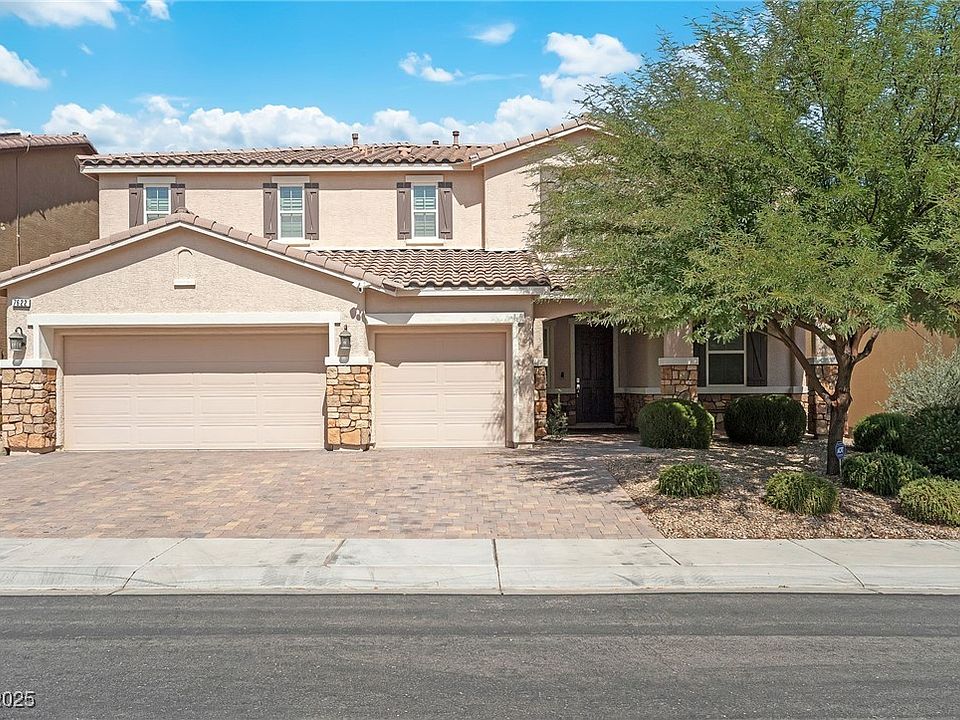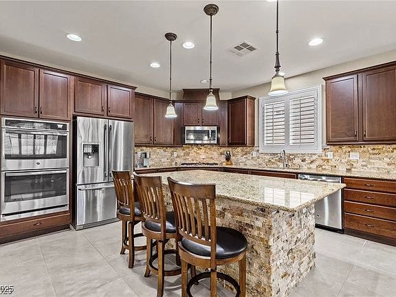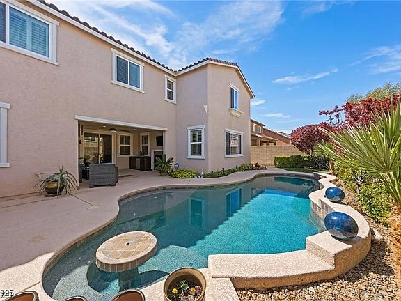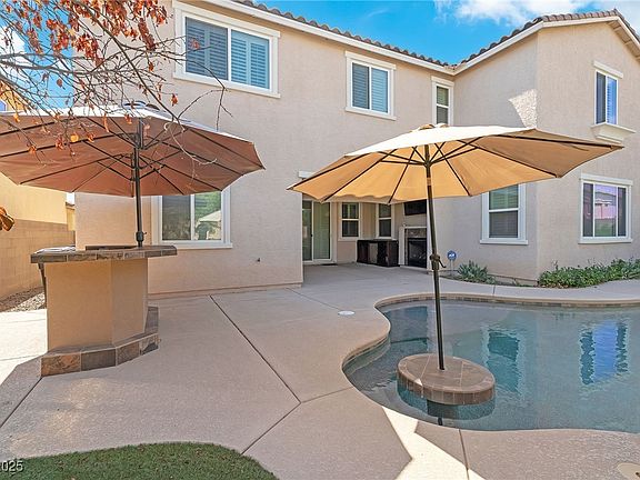 Highly upgraded Mountains Edge beauty with every detail designed for luxury living and entertaining. This expansive 3800 sqft+ 5-bed/4 full bath home (bedroom and full bath downstairs) showcases stone accents, granite counters, and premium stainless steel appliances throughout. A chef’s dream kitchen is complemented by a butlers pantry and five refrigerators across the home — kitchen, patio, BBQ island, and two in the wet bar. The backyard is an entertainer’s paradise with a sparkling Pebbletech pool, covered patio, and outdoor BBQ setup. Fully integrated smart home features include garage, thermostat, pool, Ring doorbell, cameras, sprinklers, and alarm system. The garage offers 220v for an electric car. A 100" TV with built in surround sound in the loft is a dream for movie night. 3 car Garage has epoxy floors and overhead storage. With ample upgrades, modern convenience, and indoor/outdoor lifestyle, this is the perfect Las Vegas retreat.