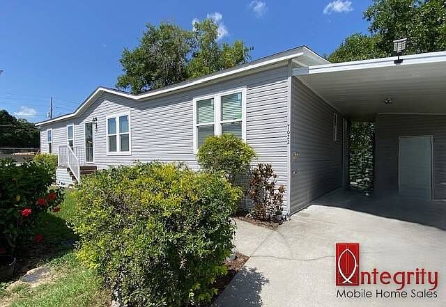 This spacious 3-bedroom, 2-bathroom home is located in the family- and pet-friendly community of Audubon Village. Step inside to discover an open-concept layout that seamlessly connects the kitchen and living room, creating the perfect space for gathering and entertaining. The living room and bedrooms feature cozy carpeting, while luxury vinyl plank flooring flows throughout the rest of the home for a stylish and durable finish. The kitchen boasts a large island with built-in storage and barstool seating, complemented by gray cabinetry, a sleek stainless steel farmhouse sink, a stainless-steel refrigerator, and black appliances. New AC 2025! Modern ceiling fans are installed throughout the home, adding comfort and a contemporary touch. The generous primary suite includes a private en suite bathroom, while two additional guest bedrooms provide plenty of space for family or visitors with a guest bath nearby. A secondary living area offers even more room to relax or entertain. Conveniently located off the side entrance is a laundry area, which leads directly to the covered carport. An attached storage shed provides extra space for tools, equipment, or seasonal items. Lot rent is $740 and includes sewer, water trash and access to all amenities that the community has to offer! Don't miss your chance to own this beautiful home in a vibrant Orlando community-schedule your showing today! All listing information is deemed reliable but not guaranteed. Prospective buyers are encouraged to independently verify details through personal inspection with appropriate professionals. Integrity Mobile Home Sales does not guarantee or warrant the accuracy of this information, including measurements or property conditions. All measurements are approximate.