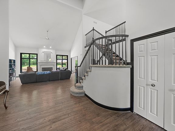 As you enter the impressive foyer, soaring two-story cathedral ceilings set the tone for the open and airy layout. The spacious great room features a cozy fireplace, high casement windows that bathe the space in natural light, and newer luxury vinyl plank flooring for a modern touch. To the right, a formal dining room provides an elegant space for entertaining. The kitchen is equipped with a central island and flows effortlessly into a three-season porch, perfect for enjoying quiet mornings or evening gatherings. Step outside to a large deck that overlooks a secluded, wooded backyardideal for outdoor entertaining and relaxation.