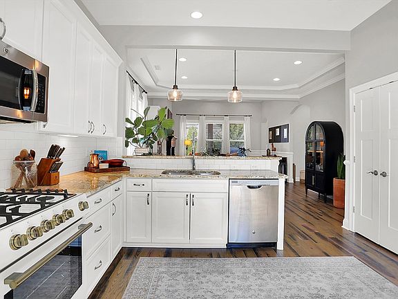 This custom-built home offers just under 2,500 sqft of thoughtfully designed space, blending lower-maintenance living with the craftsmanship and community that make Stonegate one of Zionsville's most sought-after neighborhoods. The primary suite is conveniently located on the main level and features an en suite with dual vanities, a tiled shower, and a generous walk-in closet. Just beyond the guest entry, you'll find an open-concept living area where coffered ceilings, a grand gas fireplace, wainscoting, and custom built-ins set the tone for quality that can be expected throughout. The kitchen, dining, and living spaces flow seamlessly together, with granite countertops, soft-close cabinetry, a French-door pantry, and bar seating-all ideal for ease of back patio entertaining which is just beyond the kitchen space. Upstairs, a loft separates two bedrooms and a full bath with double sinks and granite countertops. A large bonus room offers versatile possibilities-currently an office and sitting room, but easily a fourth bedroom (with the addition of a closet) or second hangout space. Every room is filled with natural light thanks to custom-placed windows throughout. The home's Americana curb appeal shines with white HardiePlank siding, cedar columns, a black front door, and a welcoming porch framed by updated landscaping. Out back, enjoy a private fenced yard enhanced with lattice for greenery. The 2+ car garage offers ample side and front storage, while the owners' entry provides built-in organization with a boot bench, coat closet, and a fully outfitted laundry room complete with folding counter, cabinetry, and utility sink. Stonegate is known for its luxury homes, neighborhood amenities, and unmatched location-walk to elementary and middle schools, enjoy community engagement and gathering spaces, and reach downtown Zionsville's brick streets within minutes. Perfect for those seeking manageable space, custom quality, and community connection.