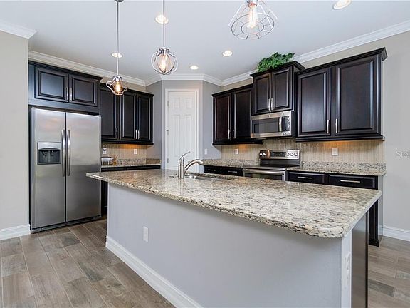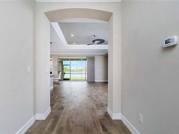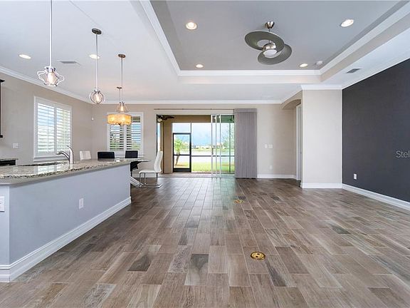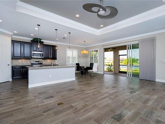 MLS# T3237065 Beautifully UPGRADED home located in the newest section of Talon Bay features spacious lake views on a quiet cul de sac. Walkthrough the beautiful etched door into the impressive foyer with custom tile floor. Living and kitchen combination shows off an open floor plan with a huge walk-in pantry. Master suite features tray ceiling, large his and her walk-in closets, dual sinks, separate water closet, garden tub, and doorless walk-in shower. UPGRADES include high-end lighting fixtures, crown molding, security system, and plantation shutters and wood blinds. It also includes newly installed hurricane shutters covering the entire home an lanai. Triple sliders open to the tranquil lakeview with west exposure. Homeowner association dues are $158/monthly.