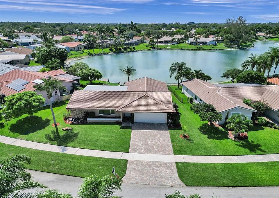 Lakefront sunsets every night! This 3-bed, 2-bath home offers peaceful water views & visiting wildlife right in your backyard. Relax & entertain year-round on the covered, screened-in patio overlooking the lake. Hurricane impact windows, sliders, & doors provide safety, comfort, & energy efficiency. Located minutes from Centennial Park & downtown Coral Springs. Inside, the split floor plan, vaulted ceilings, & natural light create a feeling of comfort. The kitchen offers extra cabinet space & buffet area, while both bathrooms have been tastefully updated. The spacious primary bedroom includes an oversized closet. Pride of ownership shines throughout with well kept landscaping. The irrigation system pulls water from the lake, helping save on utility costs. Low HOA of just $175 per year.