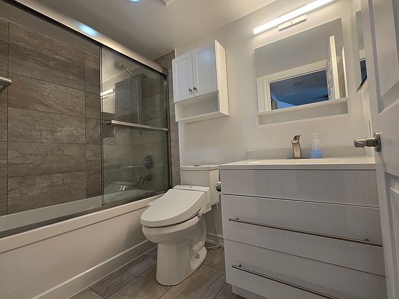 Black quartz countertopsWhite cabinetryTile backsplashLarge undermount sinkFully renovated bathroomAll new fixturesQuiet east facing view