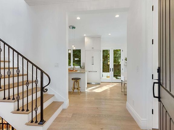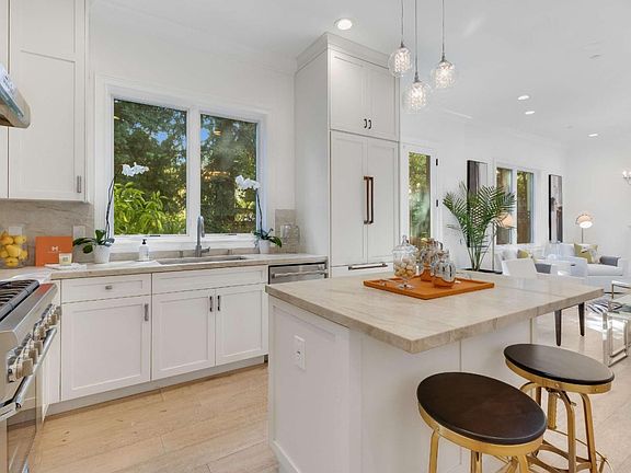 Exquisite Character. An expansive driveway clad with handsome pavers and palm trees forms an impressive entrance to this home that presents the very best of Silicon Valley living. The inviting property completed in 2017 is nestled in a private setting, creating a luxurious European-inspired retreat with three levels of top-quality craftsmanship that offers light-filled spaces, stunning natural stone finishes, floors of wide-plank engineered European white oak, and Thermador appliances. Scrupulous detail was poured into every room, providing warm, versatile spaces where classic refinement meets modern necessity. Sizable and richly landscaped, the backyard is appointed with a beautiful terrace, perfect for outdoor entertaining. Within walking distance of the enchanting Allied Arts Guild, serene parks, and world-class shopping and dining at Stanford Shopping Center, residents will also be near highly desired schools, Stanford University, and lively downtown Menlo Park and Palo Alto.