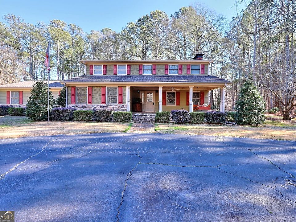 Beautiful home with so much to offer. 3 acres. First sight is the large inviting front porch overlooking the wooded private lawn. Step into the foyer and view the gorgeous hardwood flooring and large stone fireplace. Master suite is downstairs. All three bedrooms are extra large and each bedroom has his and her closets. Sunroom overlooks the private backyard. Attached garage for two vehicles, 2 car carport and a detached garage with 4 bays along with 3 outside bays. There's also the cutest guest house with 2 bedrooms, bath, full living quarters. Unwind on your back porch with wood ceiling! Guest house is currently rented. Access to guest house and detached garage will be allowed during due diligence period.