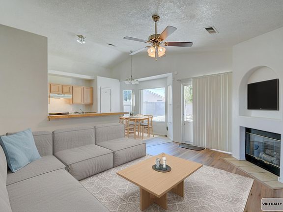 Adorable and move in ready. Bright and sunny two bedroom two bath plus with a fireplace. Plus office/Flex space allows for a third room possibility currently opens to living room but could be closed off or Glass Doors can be added for privacy. New laminate floors installed 10/24, Owned solar panels, current electric bill is $12/mo, Metal Roof. Low water landscaping added on 10/24. Two car garage. Freshly painted and move in ready. Come see it today.