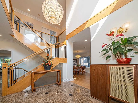 Renovated! Custom-Built Luxury Home in Prime Location. Immaculate one-owner home on a beautiful cherry blossom-lined street! Sitting on a 43x138 ft (5,950 SF) lot, this spacious home offers over 3,500 SF of living space with 6 bedrooms and 4 full bathrooms, including a main-floor bedroom and bath — perfect for guests or extended family. Features include a gourmet kitchen with custom maple cabinets, granite counters, and gas range, elegant formal living and dining rooms, and a large master suite. The bright lower level has 2 bedrooms, a large rec room/kitchen, and potential for an in-law suite. Extras: Heated hardwood floors, HRV system, and high-end finishes throughout. Just a 5-minute walk to the Canada Line and located in the Churchill School District. Open house: Nov 2, Sun, 2-4PM.