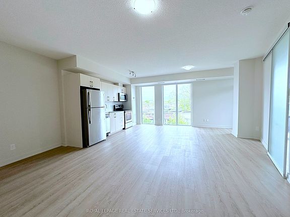 Bright and modern 2-bedroom corner suite featuring an open-concept layout. Floor-to-ceiling windows fill the space with natural light, highlighting the stylish laminate flooring throughout. The primary bedroom boasts its own floor-to-ceiling windows with views overlooking the balcony, while the versatile second bedroom is perfect as a guest room, office, or den. The kitchen is designed with light-toned cabinetry, a white tile backsplash, and track lighting. Enjoy the convenience of an ensuite washer and dryer. With its contemporary design and unbeatable location close to shops, dining, and transit, this condo is a must-see! A leisurely walk to Woodbine Park or Woodbine Beach with easy access to the TTC streetcar right outside your doorstep. Great building amenities including a fully equipped fitness centre and a beautiful 3rd-floor terrace complete with barbecues. Parking available to rent. Tenant to pay hydro and water.