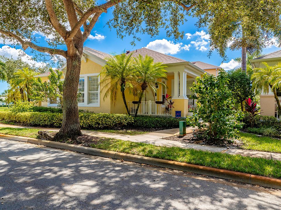 This extremely rare 2/2/2.5 + den Plus a detached 1/1 Apartment with separate entrance is 1 of only 10 in the community! Located less than 1 block from the community pool, park and playground. This spectacular unit has a 23' roof and HWH. Main house features crown molding, upgraded 42'' kitchen cabinets, granite counter tops, plantation shutters and so much more! Tiled common areas with carpeted bedrooms and open Den/office space. Primary bathroom remodel features make-up area, vanity with new faucets & mirrors. Separate full apartment with spacious balcony and street parking allowed for guests