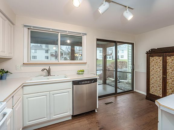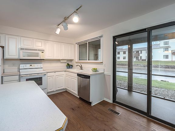 Just Listed Woodbridge Hills condo. Ground level, no stairs to this updated unit. Living room featuring gas log fireplace flanked by windows. living room open to the dining room and kitchen. Seller has updated the kitchen with white cabinets, counter tops and the appliances are included. Additional updates include wide plank flooring and neutual paint throughout. Primary suite with private bathroom and walk-in closet, second bedroom and full family bath, both bathrooms are nicely updated. Patio door from kitchen to the covered screend patio, looks on to the pond, outdoor furniture included. Main level laundry. Most windows have been updated, interior of garage recently painted. One car attached garage with opener. Seller has always felt safe and secure. Reasonable monthly Consumers $95