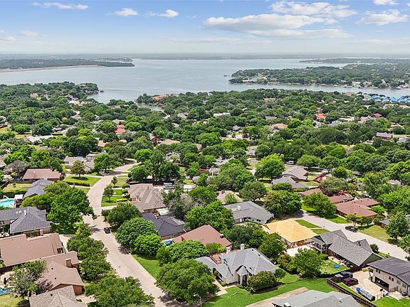 This beautifully updated three-story traditional is tucked away on a hard to find lot in the sought-after Lake Country Estates - offering a secluded retreat surrounded by mature trees & nature-inspired surroundings—all just minutes from city amenities. This home features 4 spacious bedrooms, 4.5 bathrooms, complemented by wood flooring in the main areas, and walls of windows that bathe the interior in natural light while framing breathtaking sunset views over Eagle Mountain Lake. Three unique outdoor areas include: a newly remodeled, extra-large balcony deck with Italian-style wrought iron banisters & 25-year engineered composite pavers, a shaded walkout patio off the basement, and an outdoor area is a full-size wooden deck overlooking the backyard with a gas tap for an outdoor kitchen, also with views of the lake! The walkout basement, freshly updated with new paint, flooring, drywall, and carpet, includes a half bath with new fixtures, perfect space for a rumpus room, media-game room, or bring your HGTV dream ideas to life! This chef's kitchen boasts quartz countertops, Italian designer tile mosaics, and an oversized walk-in pantry, while the expansive main living room offers skylights & a welcoming WBFP. Highlights include a separate home office with French doors, and an oversized laundry room with dual sinks. Upstairs, the owner’s suite provides private access to the balcony with lake views. 2 additional bedrooms, 1 offering its own private ensuite & the other bedroom has direct balcony access. Large U-shaped driveway with space for 3+ additional vehicles, an extra-large 2 car garage with built-in shelving, pegboard walls, and ample storage with both a large outdoor shed & a smaller utility shed. Updates: A new HVAC system (2024), new ductwork, roof (2022), vinyl double-pane windows, piered main slab, recently painted & stained the back deck, fresh landscaping & French drains. This one-of-a-kind home is the perfect backdrop for elevated lake living!