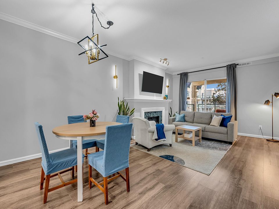 Welcome to St. Albans Court! Spacious & bright 2-bedroom, 2-bathroom CORNER home with high ceiling. Beautifully renovated kitchen and bathrooms, newer appliances and flooring. Enjoy a large private balcony facing the quiet courtyard. Lots of natural sunlight from SOUTH and west exposure. Features 4-piece ensuite, gas fireplace, and full-size washer/dryer. Includes one secure underground parking & one locker. Stroller/wheelchair friendly. Centrally located near shops, restaurants, cafés, parks, schools, and transit. School catchment: General Currie Elementary & R.C. Palmer Secondary. OPEN HOUSE: Saturday & Sunday.