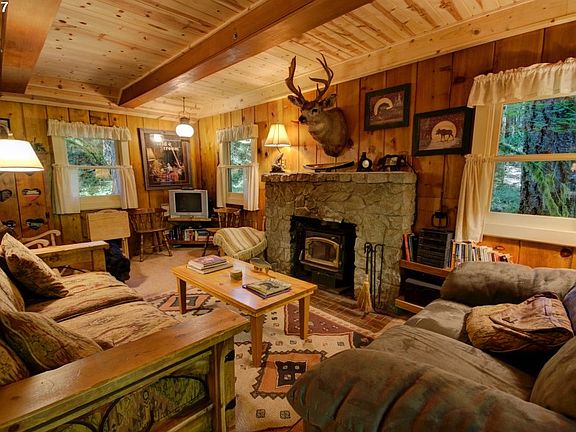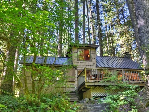 Camp Creek cabin in the Mt. Hood National Forest on leased land. Charming knotty pine throughout and a large stone fireplace in the living room. Large deck area overlooking the creek and forest view. 3 bedrooms, 2 with built in bunk beds. Bathroom with stack washer and dryer. It's the perfect getaway along dog and kid friendly Camp Creek. Only about ten minutes to slopes and hiking and biking trails nearby. Cash only, 1 hr. to PDX