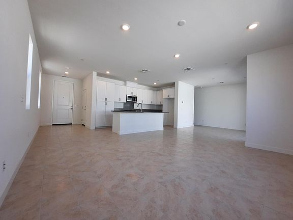 The open layout connects the kitchen, dining, and living areas, creating a bright and comfortable space. The kitchen includes stainless steel appliances, plenty of cabinets, and a center island that also serves as a breakfast bar.