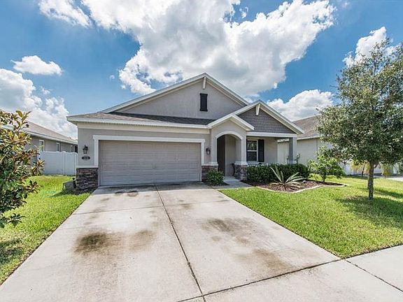 Welcome home to this 3 bedroom/ 2 bathroom beauty. The home features an inviting front porch and open floor plan. The kitchen has stainless steel appliances, granite counter tops, plenty of counter space, and a walk in pantry. The master bedroom is off the main living space and faces the large, fenced in backyard. The master bathroom has his and her sinks. The other two bedrooms are at the front of the house. There is a screened in lanai area off the dining room- perfect for entertaining. Palm Cove is a great community with a lovely pool, and two parks. If you are looking for a well maintained, modern home in a great location, this is the one!