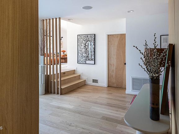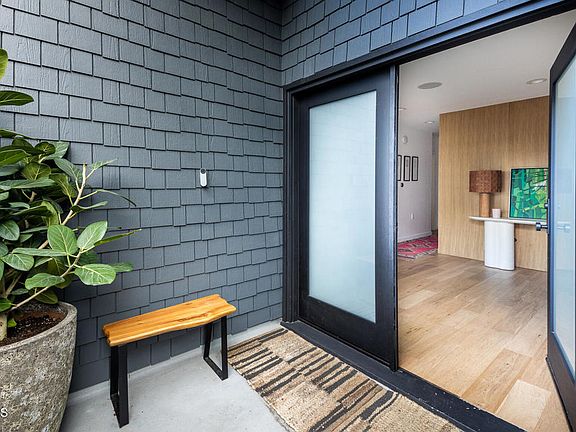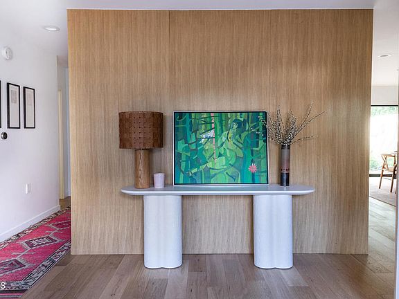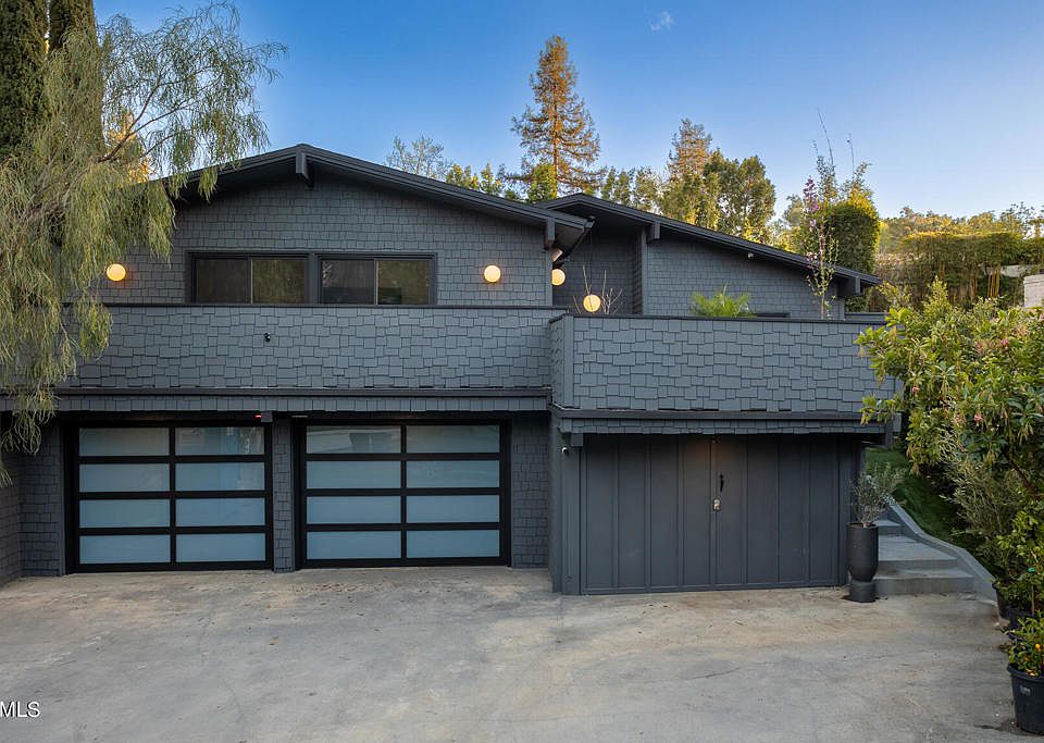 This shingled mid-century modern home on Woodrow Wilson Dr, deemed the 'celebrity row' of the Hollywood Hills, was recently updated with designer touches. The private home is sited above the street beyond an ample driveway and three car garage. Beyond the house, a large, flat yard, complete with pool and spa, has recently undergone a resort-like landscape renovation. Inside, a wood-paneled entryway connects the living room with its vaulted ceiling and spacious entertaining balcony to the open kitchen and dining area. The newly renovated kitchen features oak cabinets and sumptuous green Zia tile as well as a long list of appliance upgrades including a Thermador column touch-open refrigerator and freezer. The dining room features a fireplace and Fleetwood sliders connecting the space to an Ipe dining deck with a new trellis above. The bedrooms and bathrooms are on the other side of the house. Two of the bedrooms open onto the Ipe pool deck with views of the verdant backyard beyond. The primary bedroom is en-suite and features a walk-in closet. Both bathrooms have been updated with tasteful yet spirited fixtures and finishes. This thoughtfully-renovated home just might be the perfect Hollywood Hills refuge.