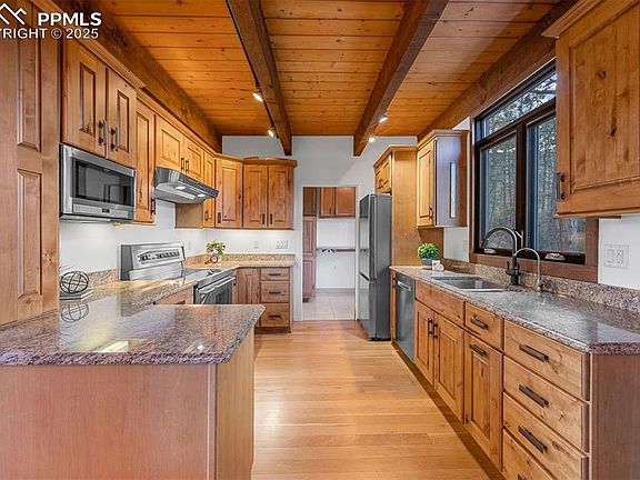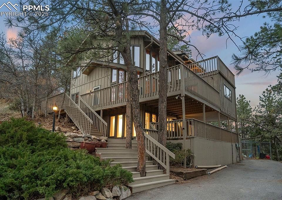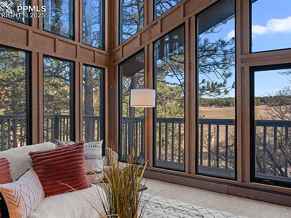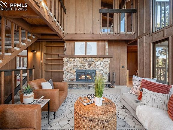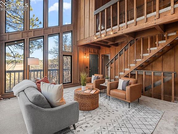 Tucked into nearly an acre of pristine forest in sought-after Perry Park, this custom cabin built in the 1970s has been thoughtfully updated to enhance its natural beauty while offering contemporary comforts. Floor-to-ceiling windows in the spacious living room frame breathtaking views of towering pines, dramatic rock formations, and an open meadow. A custom stone mantel anchors the space, inviting you to curl up by the fire and take in the natural beauty around you. Transition into the dining room and upgraded kitchen where rich wood floors, sleek Samsung and Bosch stainless steel appliances, and granite countertop provide style and function. Two bedrooms and a bathroom complete the main level. Upstairs, the primary bedroom with ensuite bathroom overlooks the great room, offering incredible views and a private deck (new in 2025). A fourth bedroom and another bathroom are perfect for family, guests, or work-from-home space. Multiple decks and patios create seamless indoor-outdoor living to enjoy the peaceful surroundings every season of the year. Downstairs, the finished basement is bright and spacious, with a family room and a fourth bathroom. There is a large storage room with a workshop bench and a flex space that can be used for additional storage or a home gym. The fully fenced backyard backs into a wooded acre with direct access to a private creek and secluded hiking trails. This home isn’t just beautiful—it’s practical, too. With a newer roof (2019), tankless hot water heater (2023), new split AC units in each bedroom, upgraded electrical capacity, fully paid-off solar panels, and new EV charging station and RV hook-up in the driveway, you’ll enjoy modern efficiency without sacrificing mountain charm. Located in one of Larkspur’s most fire-wise communities, access to the Perry Park Country Club and golf course, an equestrian center, and hiking trails make this home the one where you can hike, golf, entertain, or simply relax in your one-of-a-kind retreat.