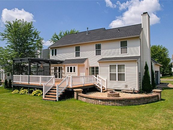 Back on the market—no fault of the seller! Enter through elegant front doors into a stunning 2-story foyer with an office perfect for remote work. The gourmet eat-in kitchen boasts a subway tile backsplash, farm sink, butcher block island, lighted soft-close cupboards, and high-end KitchenAid appliances. A sliding door leads to an oversized deck with a pergola and fire pit in the spacious backyard with an invisible fence and wooded views. Step down into the cozy family room and enjoy custom built-ins, a black accent mantle, and a gas fireplace. The formal dining room has classic wainscoting and oversized windows that fill the space with natural light. Off the kitchen, find a stylish half bath and built-in locker cubbies right off the garage. The finished basement includes a rec room, bar area with breakfast bar, full bath, gaming cubby, and oversized laundry room with built-ins for additional storage.Upstairs, the master suite has a vaulted ceiling, wood accent wall, and walk-in closet with built-in drawers and shelves. The master bath features a double vanity, soaking tub, walk-in shower, and private commode. Three additional bedrooms, a full bath, and a linen closet complete the second floor. Updated with a modern organic vibe, urban lighting, wood accents, and a new roof (June 2024). Located in highly desired neighborhood in Jackson Twp. with access to a clubhouse and pool!