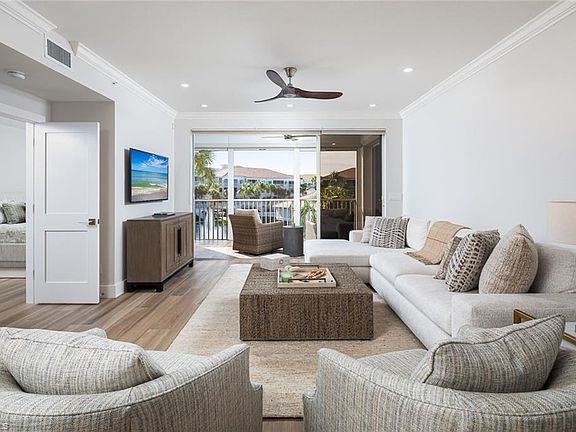 Experience Coastal Living in this Rarely Available Prime Rental, 3-bedroom, 2-bathroom end unit in Pelican Bay's Pebble Creek Community. The bedrooms consist of a King bed, Queen bed, and a Queen sofa bed for your sleeping arrangements. This Exquisitely Custom designed condo, features a grand double door entry, all new upgrades and designer furnishings. Every detail has been meticulously chosen, from the beautiful flooring to the Alpine Mist Caesar stone countertops and new Shaker kitchen cabinetry. Enjoy al fresco dining on your Lanai overlooking the gorgeous lake views, and a private garage with elevator leading directly to the front door makes accessibility extremely easy and step free. Located very close to the community amenity center which features 2 pools, spa, exercise room, clubhouse, grilling / dining area and sauna. Just a short stroll to the tram and berm that is directly across the street and leading to 3 miles of pristine beach and two private beach restaurants. You never need to search for parking in order to go to the beach. Don't miss out on this unique opportunity to Relax and Stay in Luxury by the Beach.