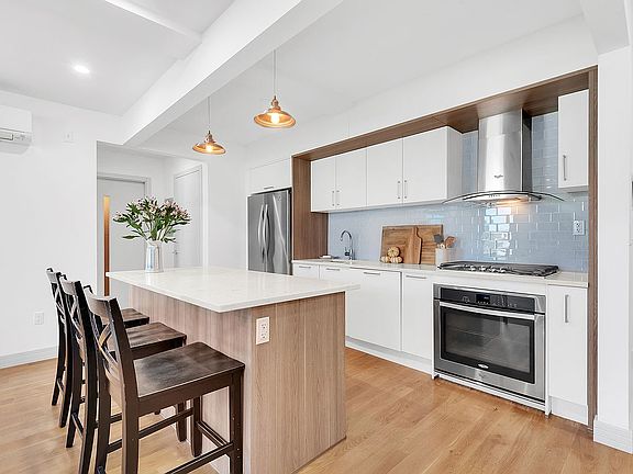 Perfect in so many ways, this multi-faceted condo unit is located on the edge of Prospect Heights and Crown Heights border. Enter into a light and spacious room with light hardwood floors throughout and a welcoming Living Room and Open Kitchen where luminous sunrises and sunsets are experienced. The modern kitchen has stainless appliances and also including an extracting fan. The versatile island provides additional counterspace for delicious meals to be prepped and then transforms into a gathering spot to taste mezzes and wine. It also provides additional storage and feature the convenience of additional outlets. Light spills into the Living Room via 2 large windows and the addition of a dining table is surely possible here. The primary bedroom is adjacent to the bathroom with ceramic tiles and a deep soaking tub. The 2nd room can be used as a home office, guest room or whatever your needs may require. A custom closet in entry, ample closets in each bedroom and shared storage in basement cancel any storage woes. A large in-unit washer/dryer, split system in 3 zones and common roof deck just 1 flight up from the apartment with stunning views of Manhattan and Brooklyn makes this apartment a sure bet!
