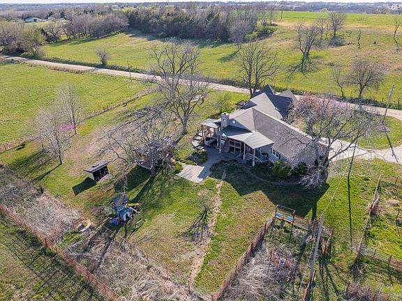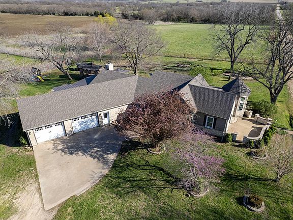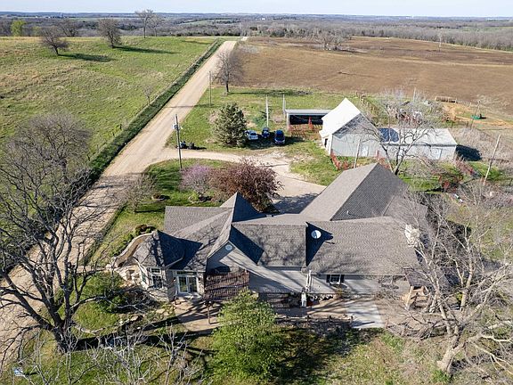 This breathtaking country estate features 4 bedrooms and 2 bathrooms nestled on nearly 7 acres complete with additional outbuildings that offer accommodations to livestock or horses. The barn has electricity on a separate meter. The barn offers 6 stalls and metal pipe corral fencing as well as the property boundary fencing. New roof, septic, and laterals added in 2022. The many modern updates make this picturesque setting a country paradise. Complete renovations took place in 2012 which included customized tile work that adds a castle-like feel to the property. Two mini split units in the basement plus a 2x220 amp power source add additional comfort and efficiency. The large windows add extra lighting but also open the beautiful view. Cathedral ceilings, stone accents, wood floors, a spacious bathroom off the kitchen, a master suite, a covered deck with bedroom access, and a massive mudroom with lockers make this a picture-perfect estate for buyers looking to own land and enjoy country living. The ideal location is in close proximity to Lawrence, Topeka, and Overbrook.