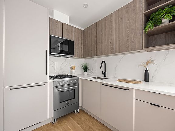 The sleek kitchen boasts ample storage inside of custom natural wood and cream cabinets, clean Quartz countertops and backsplashes, a Bertazzoni appliance package including an externally vented exhaust hood, and black hardware.