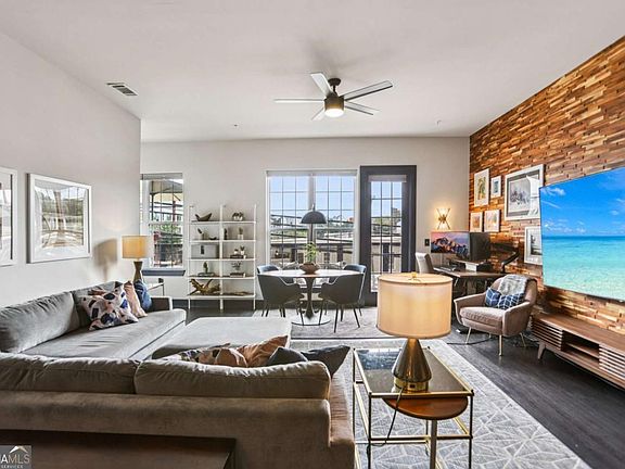 Upgraded to the 9's and perfectly placed in the heart of it all-this condo has it all going on! Walkable to Madison Yards, Glenwood Park, the Beltline, Southern Dairies, and everything Cabbagetown has to offer, this home is nestled in one of the most vibrant yet charming pockets of the city. With off and on street parking, direct street access, and quick I-20 convenience, getting around is effortless-but honestly, you may never want to leave. Inside, you'll find a truly one-of-a-kind space. The open floor plan is warm and inviting, centered around a 30-foot-wide wood slat feature wall in the living room with big south-facing windows overlooking Glenwood Park and an 85" 4K mounted TV (which is included in the sale of the home). Custom details are everywhere-deep grey water-resistant LVP floors, rich blue doors and trim, matte black fixtures, and updated LED lighting. The kitchen features black stainless KitchenAid appliances, open shelving at the peninsula, and fresh pendant lighting. The primary suite offers a boutique feel with geometric wallpaper, a double vanity (the only one in the building!), and a deep glass shelf above the sinks. Beyond the walls, this home comes with a lifestyle that's hard to beat. The sellers-the sole owners since new-have loved the friendly, tight-knit community, where neighbors are welcoming and quick to lend a hand. Cabbagetown and Reynoldstown are known for being calm, creative, and full of character-perfect for families, pets, and weekend exploring. With fantastic local restaurants, grocery stores, parks, and events like Chomp-N-Stomp, Summer Shade Festival, and the Grant Park Farmers Market, there's always something to do close to home. Walkability, warmth, and wonderful neighbors-this home truly has it all, right in the middle of one of Atlanta's most beloved neighborhoods.