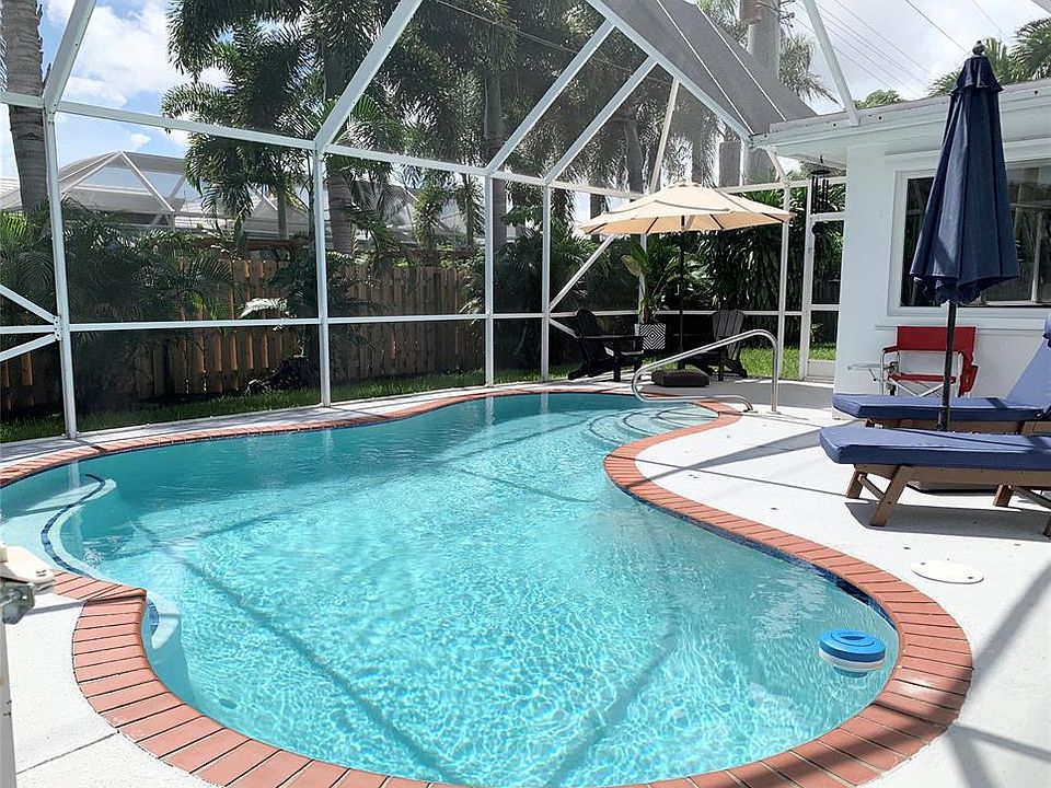 Amazing pool home, nestled in the highly desirable Royal Oak Hills community in East Boca Raton! This stylish 3-bedroom, 2-bathroom house features an open-concept floor-plan with newer plank flooring throughout. Step through double french doors into your private tropical backyard oasis, complete with a newly remodeled screened-in pool, perfect for relaxing or entertaining year-round and a fenced-in yard. NEWER: remodeled bathrooms, white quartz kitchen countertops, large deep sink, flat roof, a/c, w/h and electrical panel, for peace of mind. A spacious laundry room with an additional wall of storage. Garage was converted to a 3rd bedroom w/ac mini-split. Great location, A-rated schools, walk/bike to vibrant downtown Boca Raton, just over 1 mile to the beach.