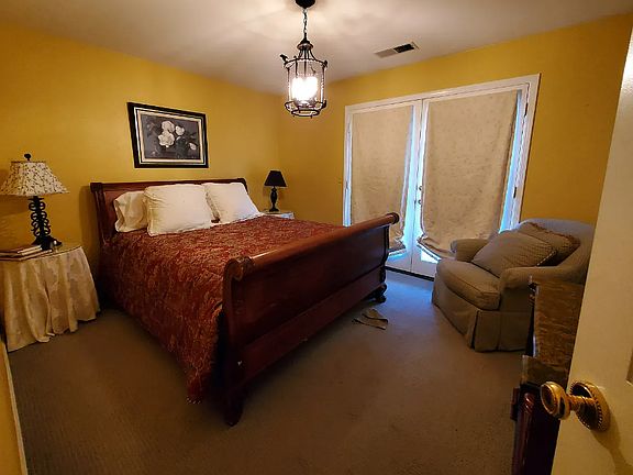 The main-floor primary suite boasts dual walk-in closets, a sumptuous bath, and direct patio access with enchanting pond views