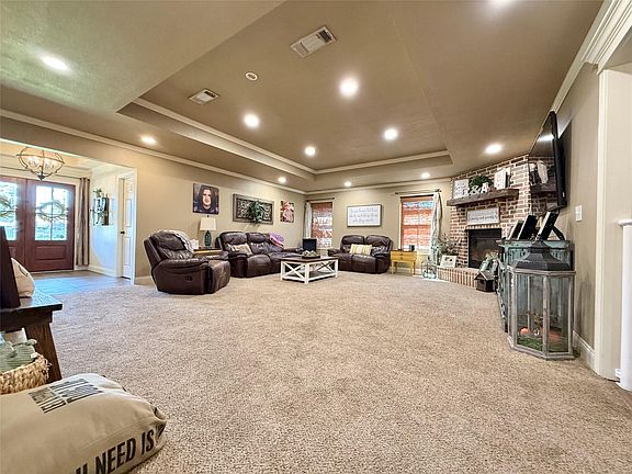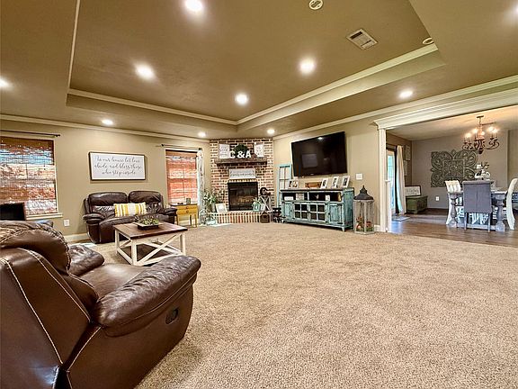 NEVER FLOODED!!! This beautiful home starts with a very well manicured yard and landscaping. Front porch is accented with rich wooden beams and has plenty of room for rocking chairs and your seasonal or holiday decorations. As you enter the home, there is a wide entry hallway that leads to the oversized living area giving extra room for all your gatherings and a fireplace to keep you warm on those cold nights. Kitchen is perfectly laid out and has ample counterspace for food prepping and offers bar seating along with dining area that can accompany a bigger table and hutch. Primary bedroom has trayed ceilings, recessed lighting, and there's even a nook that could be used for a small office or sitting area. Primary bath has double sinks, double closets, a soaker tub and separate shower. 3 more bedrooms and a full bath create the split floorplan. Backyard includes a pergola covered in Peggy Martins, a chicken coop, goatpen, and is fully fenced. And don't miss the shop with electric!