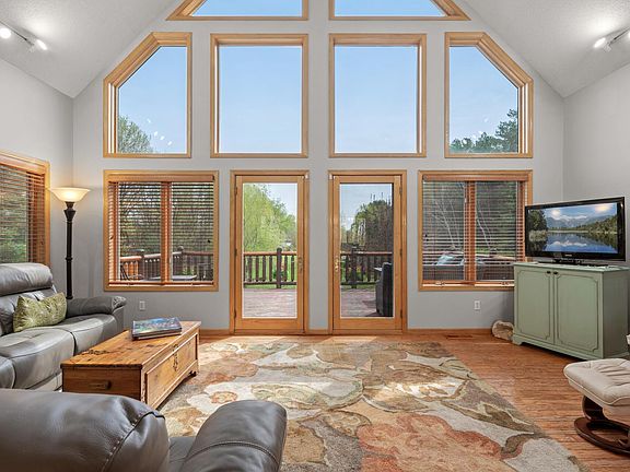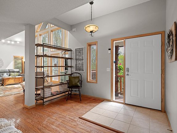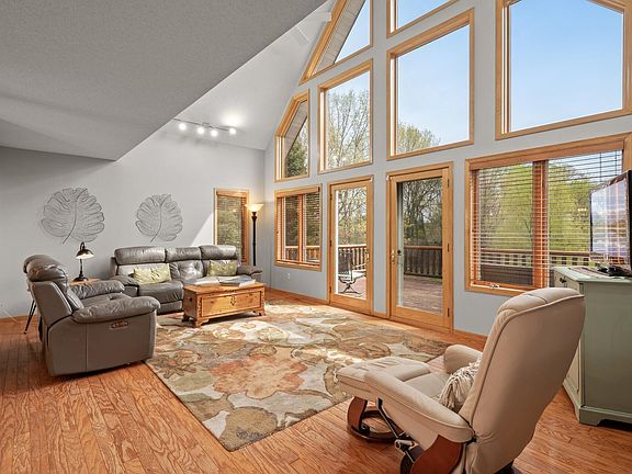 Amazing 6-acre wooded property with beautiful chalet style home! The 4 bed, 3 bath home features bright open main level with vaulted ceilings, hardwood floors, main floor bedroom, full bath & spacious living room with a wall of windows & gorgeous views! The kitchen, with granite counters & walk-in pantry, is open to an informal dining space that walks out to a large multi-level deck & pool! There is an additional space off the dining room with floor to ceiling cabinets for even more storage! The upper level features 2 large bedrooms, including a beautiful owner’s suite with walkthrough full bath. The walk-out lower level includes a family room, 4th bedroom, & another full bath. Enjoy the beautiful views from both the front & back decks! Property also includes a barn with 3 12x12 stalls, chicken coop/garden shed, detached screen porch, & apple, pear, plum & grape trees. Great opportunity to own a beautiful acreage property just outside of the cities. Ready to move in & make it your own!