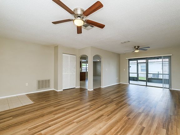 Interesting design elements bring charm to this two-bedroom, two-bathroom rental home in Port Richey, Florida. In the living room, you'll find a large front-facing window, two lighted ceiling fans, and gorgeous vinyl plank flooring that stretches from the front of the residence to the sunroom. A closet provides convenient storage. The kitchen includes tile flooring, stainless steel appliances, and an island serving as the ideal meal prep space. Steps away is the main bedroom with a walk-in closet and a lighted ceiling fan in its sleeping area. The en suite bathroom has two single-sink vanities. Schedule a time to see this rental home.